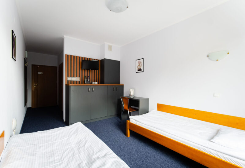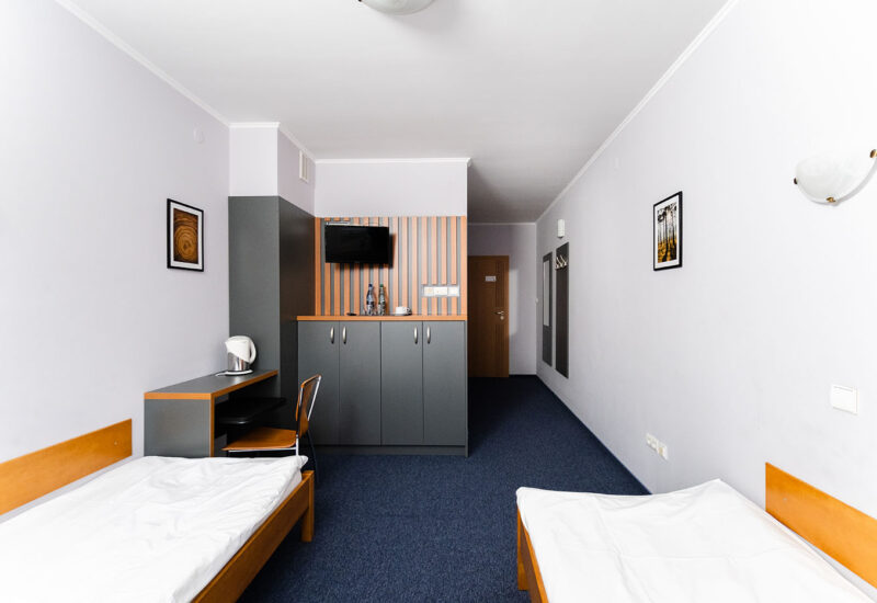 Dla osób, które interesują dwuosobowe pokoje Krosno stanowi dobrą bazę noclegową. Może skorzystać z nich zarówno para, jak i znajomi czy współpracownicy. Oferujemy pokoje w dwóch różnych wariantach: standard oraz komfort. Standardowe pokoje mają powierzchnię 20 m2 i dysponują dwoma, oddzielnymi łóżkami. Pozostałe wyposażenie pokoju stanowią pojemne szafki, w których można przechowywać zawartość bagaży. Do dyspozycji pozostaje także telewizor, stolik z dwoma krzesłami oraz zestawem do zaparzenia kawy albo herbaty. Goście mają dostęp do oddzielnej toalety oraz łazienki z prysznicem. Znajdują się w niej niezbędne akcesoria: ręczniki, mydło czy suszarka do włosów. Dzięki klimatyzacji i ogrzewaniu elektrycznemu, niezależnie od pogody czy pory roku, w pokoju panują optymalne warunki. Pokoje dwuosobowe w wariancie komfort posiadają dodatkowe atuty: wyjście na balkon z widokiem na stadion lekkoatletyczny.