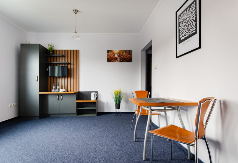 Nasze pokoje są przytulne, komfortowo wyposażone, a jednocześnie dostępne w atrakcyjnej cenie. Każdy pokój dysponuje własną toaletą oraz łazienką, co gwarantuje pełen komfort i poczucie prywatności dla naszych Gości. Dla najbardziej wymagających przygotowaliśmy apartament w wariancie standard. Składa się on z sypialni, pokoju dziennego, łazienki oraz toalety. Podczas całego pobytu do nieodpłatnej dyspozycji pozostaje także parking samochodowy oraz siłownia. Dla osób planujących wyjazdy w celach służbowych dużym atutem może być dostęp w budynku do sali konferencyjnej na 60 osób. Podobnie w tym samym obiekcie Goście mogą udać się do lokalu gastronomicznego.